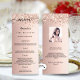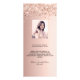 Cartão de menu de festa de aniversário. Personalize e adicione um nome, idade, data e menu. Rosa dourado falso fundo metálico, decorado com falso brilho. Letras pretas coloridas. Adicione uma foto da aniversariante, fatos e nomes divertidos.
