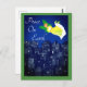 Arte popular de anjo e pombas brancas voam sobre uma cidade noturna em busca de uma temporada de férias pacífica. Paz na Terra é uma mensagem maravilhosa para o Natal, Hanukkah ou outros feriados que você deseja celebrar. Adicione sua mensagem pessoal no verso.