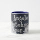 Caneca do estilo da campainha com borda azul e punho com as palavras "anjos que olham sobre mim" com dois anjos nas nuvens de cada lado. Deixado alguém saiba que um poder mais alto está olhando sobre elas.
