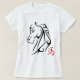 trabalho de arte de cabeça de cavalo preto com símbolo vermelho de caráter chinês para o Cavalo. Este design é mais bonito em camisas brancas ou de cor clara. O Ano do Cavalo é de ação, aventura, viagem e romance. O cavalo representa também progresso, carisma, trabalho produtivo, energia solar e liberdade. Se você estava nascer em um ano do Cavalo você é charmoso, social, confiável e aberto. Você pode ser extravagante e é frequentemente a vida da festa. O Cavalo é um poderoso animal para muitas pessoas, incluindo pessoas de negócios, viajantes, atletas, construtores e engenheiros, artistas e artistas, pessoas em vendas ou ocupações socialmente orientadas, aqueles que trabalham perto (ou com) da Terra. Na astrologia chinesa, Cavalo é um sinal de fogo e associado ao número sete.