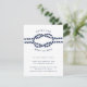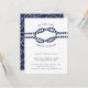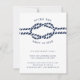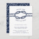 O nosso casamento de chic costeiro após convites de festas apresenta o estilo náutico clássico em azul e branco marinho. "Depois que o nó está amarrado" aparece no topo, curvado em torno de uma ilustração de corda azul-marinho. Personalize com seus detalhes de celebração após a festa em uma combinação chic de serif e sans serif lettering. Perfeito para casamentos náuticos, de praia ou de verão. Cartões que se revertem a um padrão de corda náutica de looping, de cor branca, em marinho. Os ajustados de tamanho de petição no seu convite de casamento se envolvem como uma inserção, ou funciona como um convite autônomo também.
