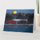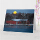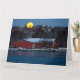 Antiga casa de barcos de madeira vermelha com lua cheia ao fundo e Mar Báltico gelado ao fundo em Lauttarsaari, cartão de saudação dobrado de Helsinki.