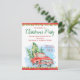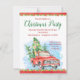 Convites de festas de Natal com caminhonete vermelho-vivo e árvores de Natal num fundo festivo de poinsettia vermelha e verde.