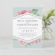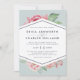 Os convites de casamento elegantes apresentam uma mistura chic de florais de aquarela vintage e elementos geométricos modernos em um fundo verde de sábio mudo. Um spray de flores cor-de-água cor-de-rosa pincelada espia do topo e do fundo de um elemento em forma de diamante central esboçado em azul-da-noite, segurando seus detalhes de casamento em letras limpas e modernas. Cartões invertem para ricos azuis da meia-noite com um padrão sutil de diamante pontilhado.