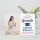 Compartilhe a alegria de uma formatura do ensino médio ou faculdade com esses anúncios de fotos personalizados vermelhos, brancos e azuis. (DICA DE POSICIONAMENTO DE IMAGEM: Uma maneira fácil de centralizar uma imagem exatamente como você deseja é cortá-la antes de fazer o upload para o site da Zazzle.) Este modelo é simples de personalizar com qualquer texto de sua escolha, como detalhes do convite da festa, nomes dos pais, honrarias especiais, título do diploma, citação inspiradora favorita, informações de contato do graduado, planos de educação futura ou nova posição no emprego. Se houver algum texto que não seja desejado, basta excluí-lo. O design apresenta um fundo branco, boné azul, caligrafia de estilo manuscrito, tipografia moderna e elegante, e uma foto de sua escolha, como uma foto de formatura ou imagem da cerimônia de formatura. Esses cartões de anúncio de formatura elegantes são uma maneira elegante de compartilhar a celebração do seu dia especial com