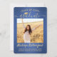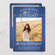 Compartilhe a alegria de um segundo grau ou formandos com estes anúncios personalizados de 2 fotos azuis e dourados. (DICA DE IMAGEM: Uma maneira fácil de centralizar uma imagem exatamente como você deseja é recortá-la antes de carregá-la no site do Zazzle.) Este modelo inclui o nome do formando, o ano de aula e a escola, e é simples de personalizar com qualquer texto de sua escolha, como detalhes do convite de festas, nomes de pais, honras especiais, título do grau, citação de inspiração favorita, informações de contato do formando, planos educacionais futuros ou nova posição de emprego. Se houver algum texto não desejado, simplesmente exclua-o. Design apresenta um fundo azul-real escovado, boné de conselho de morteiro de folha falsa, caligrafia de script escrita à mão, tipografia moderna minimalista e duas fotos de sua escolha, como fotos de mais velho ou imagens da cerimônia inicial. Observe que o ouro é impresso a cor, não a folha metálica. Estes cartões de anúncio elegantes de formatura são uma forma na moda para compartilhar sua celebração especial com a família e os amigos. Parabéns ao formando!