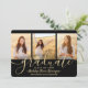 Compartilhe a alegria de um segundo grau ou formandos com estes anúncios personalizados de 4 colagens de fotos em preto e ouro. Todas as imagens e textos são simples de personalizar. (DICA DE IMAGEM: Uma maneira fácil de centralizar uma foto exatamente como você deseja é recortá-la antes de carregá-la no site do Zazzle.) Este modelo pode ser personalizado com quaisquer detalhes de sua escolha, como informações sobre convites de festas, nomes de pais, honras especiais, título de grau, citação inspiracional favorita, informações de contato do formando, planos educacionais futuros ou nova posição de emprego. Design apresenta um fundo preto, boné falso de morteiro de folha de alumínio, caligrafia de script de estilo manuscrito, tipografia moderna minimalista e quatro fotos de sua escolha, como fotos de mais velho ou imagens da cerimônia de início. Observe que o ouro é impresso a cor, não a folha metálica. Estas elegantes cartas de graduação são uma maneira moderna e chique de compartilhar sua celebração especial com a família e os amigos. Parabéns ao formando!