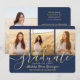 Compartilhe a alegria de um segundo grau ou formandos com estes anúncios personalizados de marinho de colagem de 4 fotos, azul e ouro. Todas as imagens e textos são simples de personalizar. (DICA DE IMAGEM: Uma maneira fácil de centralizar uma foto exatamente como você deseja é recortá-la antes de carregá-la no site do Zazzle.) Este modelo pode ser personalizado com quaisquer detalhes de sua escolha, como informações sobre convites de festas, nomes de pais, honras especiais, título de grau, citação inspiracional favorita, informações de contato do formando, planos educacionais futuros ou nova posição de emprego. Design apresenta um fundo azul escuro, boné de conselho de morteiro de folha falsa, caligrafia de script escrita à mão, tipografia moderna minimalista e quatro fotos de sua escolha, como fotos de mais velho ou imagens da cerimônia de início. Observe que o ouro é impresso a cor, não a folha metálica. Estas elegantes cartas de graduação são uma maneira moderna e chique de compartilhar sua celebração especial com a família e os amigos. Parabéns ao formando!