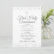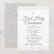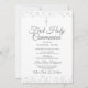 Cartão de anúncio adiado de primeira comunhão prata com delicado brilho de estrelas prateadas, pode personalizar com as informações da sua primeira comunhão especial em texto prateado elegante. Concebido por Thisisnotme©