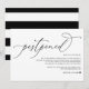Mude a data! Anuncie para a sua família e amigos o adiamento do seu casamento com este cartão de mudança de data. Ele apresenta um padrão de letra e listras caprichosas. Personalize adicionando seus nomes e outros detalhes. Este cartão de adiamento de casamento também será perfeito como um anúncio de casamento às escondidas.