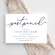 Precisa adiar o seu casamento ou mudar a data? Informe os convidados com estes cartões de anúncio de adiamento de casamento simples e elegantes. O design chic em azul marinho e branco apresenta "adiado" no topo em letra de caligrafia manuscrita, com seus nomes e nova data abaixo. Ajuste a redação e o nível de detalhe conforme necessário. Conforme mostrado, o texto de exemplo direciona os convidados ao seu site de casamento para informações adicionais.