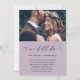 Mudança simples da data anúncio de adiamento do casamento. Este anúncio simples é uma maneira elegante de informar aos convidados que a data do casamento foi remarcada devido a circunstâncias imprevistas, e inclui a nova data do casamento. Este anúncio moderno apresenta uma adorável caligrafia preta "nós ainda nos casamos" em um fundo roxo defumado com a foto do casal, e um verso do cartão com um tom roxo suave.