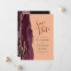A borda esquerda deste elegante casamento moderno salve o cartão de data apresenta uma borda de cor-d-água borrifada, aparada com falso brilho dourado. O texto personalizável combina a escrita manual, a escrita e as fontes itálicas de cinza de burlôncio e carvão em fundo de pêssego. O lado inverso apresenta uma burgundy e uma design de agata dourada.