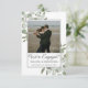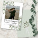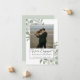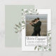 Este belo cartão é uma maneira maravilhosa de anunciar a grande notícia aos seus amigos e familiares. Concebido como um precursor de um cartão de "salve a data", a legenda neste cartão simplesmente diz "estamos noivos" com espaço para seus nomes e uma pequena nota. O adorável design apresenta raminhos rústicos pintados à mão com aquarela de eucalipto e folhagens. A parte traseira é de uma cor verde sage pálido com um buquê de folhagens em aquarela amarrado com um laço de cetim branco.