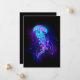 Água-viva grande, azul, desenhada artisticamente, brilhante, brilhante, com longos tentáculos sobre fundo preto com bioluminescência roxa. Água-viva luminosa.