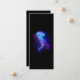 Água-viva grande, azul, desenhada artisticamente, brilhante, brilhante, com longos tentáculos sobre fundo preto com bioluminescência roxa. Água-viva luminosa.