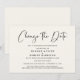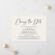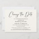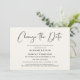 Anúncio minimalista de adiamento de casamento moderno em creme claro e elegante. "Mudamos a Data" está escrito em uma fonte estilosa e você pode personalizar facilmente com os detalhes do adiamento do casamento.