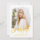 Anúncios de graduação de tendências que apresentam o dentro de fotos do formando de um quadro de máscara texturizado com "Formando" em um script manuscrito amarelo. Personalize a frente dos anúncios de graduação de fotos adicionando o nome do formando, o nome da escola e o ano de graduação. O anúncio é revertido para exibir um design de listração amarelo e branco.