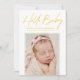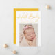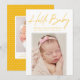Cartão de anúncio de nascimento moderno com "Hello Baby" num guião de assinatura amarela com o nome do seu bebê, estatísticas de nascimento e fotografia apresentada abaixo. O cartão de anúncio de nascimento de foto é revertido para exibir uma foto adicional e uma mensagem pessoal com fundo de bolinhas amarelo e branco.