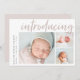 Um cartão de anúncio de nascimento elegante e moderno, com três fotos (um quadrado e dois horizontais), com "introdução" no topo, em letras, à tipografia de pincel. Personalize com o nome do seu bebê e as estatísticas de natalidade ao longo do lado esquerdo. Adicione uma mensagem pessoal ao verso, juntamente com uma foto adicional.