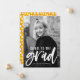 Na moda, modernos anúncios de graduação apresentando a foto vertical do formando com "Cheers to the formando" em um roteiro branco, com letra de pincel. Personalize a frente do anúncio adicionando o nome do formando, o nome da escola e o ano de graduação. O anúncio de graduação de fotos é revertido para exibir um padrão abstrato amarelo-ouro e branco.