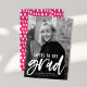 Na moda, modernos anúncios de graduação apresentando a foto vertical do formando com "Cheers to the formando" em um roteiro branco, com letra de pincel. Personalize a frente do anúncio adicionando o nome do formando, o nome da escola e o ano de graduação. O anúncio de graduação de fotos é revertido para exibir um padrão de abstrato branco e rosa quente.