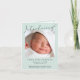Um simples cartão de nascimento dobrado, sem distinção de gênero, verde-menta pastel. A frente apresenta a foto do seu recém-nascido, o nome do cheio, a data de chegada e as estatísticas de natalidade e "Apresentando" escrito em um roteiro de na moda final com uma batida cardíaca. Na dentro da placa, adicione três fotos adicionais e um obrigado personalizado, você ou outra mensagem, com espaço para uma nota manuscrita à esquerda.