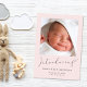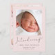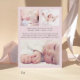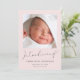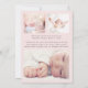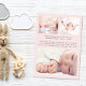 Um simples e fofo anúncio de nascimento rosa de uma menina com tipografia de cinza mole. A frente apresenta a foto do seu recém-nascido, o nome do cheio, a data de chegada e as estatísticas de natalidade, e "Apresentando" escrito em um roteiro de na moda com o fim de um coração florescente. No verso do cartão, você pode adicionar três fotos adicionais e nomes de pais e irmãos, e um obrigado, uma visita ou outra mensagem.