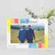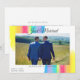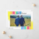 Lindo cartão de anúncio de casamento com arco-íris com belos e artísticos traços de pintura cheios de cores brilhantes em torno da foto dos recém-casados LGBTQ. Esses cartões coloridos de Recém-Casados são perfeitos para um casal gay ou lésbica.