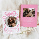 Comemore a grande conquista do seu formando com este anúncio de graduação em na moda, com um arco rosa e design de fita em negrito sobre fundo branco. A foto circular do formando é lindamente enquadrada pelo arco, enquanto o "Formando" brilha num elegante roteiro rosa escrito à mão. Personalize com o nome do formando, a escola e o ano de graduação para um toque único e eterno. A parte de trás contém uma foto e um espaço adicionais para uma mensagem personalizada, fazer este design perfeito para formandos segundos graus e universitários. Anuncie este marco especial com um chic e uma sofisticada saquê!