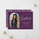Este anúncio de formatura com foto de arco moderno apresenta o retrato do formando enquadrado dentro de um rico arco roxo, com “Graduate” exibido em elegante letra cursiva branca. O nome do formando, escola e planos futuros são apresentados em letras serifadas limpas para um visual ousado e refinado. A paleta de cores roxa e branca traz um senso de celebração e distinção, ao mesmo tempo em que permanece sofisticada tanto para graduados do ensino médio quanto para universitários. O verso do cartão apresenta um padrão pontilhado roxo e branco coordenado para uma apresentação polida e coesa. Personalize o texto e a foto para criar um anúncio memorável com um visual régio e moderno.