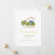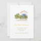 Um novo e encantador discurso/novo anúncio caseiro com uma ilustração aquática de uma casa de bungalow branca e azul com limoeiros e uma cerca de piquete branca.