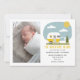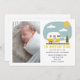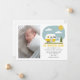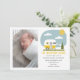 Ilustração de uma caravana amarela com roupa de bebê na corda de roupa com "A Aventura Começa" e texto personalizado para o nome do bebê e estatísticas de nascimento. Substitua a foto pela sua.