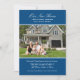 O anúncio simples e móvel apresenta o título personalizado "Nossa nova casa" no script, a foto da sua nova casa enquadrada em uma borda listrada por pinos, o texto personalizado em branco e uma cor azul-safira real. Outras cores estão disponíveis no repositório de Papel de Push e quando solicitado.