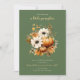 Esta modelo de anúncio de gravidez tem um design perfeito para os anúncios do outono. O fundo é um verde-oliva quente, enquanto o texto apresenta uma caligrafia elegante em um amarelo-ouro mole. No centro, um arranjo de elementos autóctones, incluindo abóboras laranja vibrantes, flores brancas e folhagem rica em tons de laranja queimada e ouro, cria uma estética sazonal aconchegante. A manchete diz "Estamos esperando um pouco de abóbora", seguida dos detalhes do anúncio. O texto abaixo inclui espaço para personalizar a data de vencimento e os nomes dos pais a serem. Esta modelo é ideal para quem procura uma forma doce e festiva de compartilhar suas notícias de bebês durante a temporada de outono.