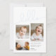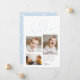 Cartão de nascimento simples e moderno para o bebê recém-nascido com um guião manuscrito que diz "olá" a azul com três imagens diferentes.