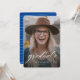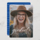 Um simples script clássico "formando" em branco acentua uma foto vertical solteiro do seu formando. Este anúncio de graduação funciona tanto para formandos da faculdade quanto para segundos graus e é simples o suficiente para deixar sua foto brilhar. É um design de eterno e também apresenta um backer listrado com uma cor personalizável (o padrão é uma forma clássica de azul brilhante).