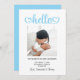 Simples, mas atraente, anúncio de natalidade azul-claro e branco com um olá com corações, texto tipografia digital. Personalize o estilo e o tamanho da fonte, conforme necessário. Você pode mudar a cor azul da palavra arte e o fundo no verso. Adicione mais fotos ou texto ao verso.