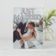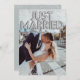Este anúncio de casamento personalizado apresenta um design de foto personalizada divertido e romântico. A frase "Casados" é impressa na parte superior em balões de folha prateada. Uma foto de amostra de uma noiva e um noivo cobre o fundo, que você pode personalizar para incluir sua própria foto personalizada do casal casado, ou outra imagem de sua escolha. Confetes prateados brilhantes acentuam as porções superior e inferior. Uma mensagem de anúncio de casamento de amostra é impressa no verso.