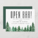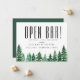 Floresta russa de aquarela, "BAR ABERTO!", humor de casamento, salve o cartão de data. A parte traseira da carta apresenta cor verde de caça sólida.