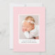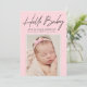 Cartão de anúncio de nascimento moderno com "Hello Baby" em um script de assinatura preta com o nome do seu bebê, estatísticas de nascimento e foto exibida abaixo em um fundo rosa. O cartão de anúncio de nascimento de foto é revertido para exibir uma foto adicional e uma mensagem pessoal com fundo de bolinhas rosa e branco.
