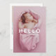 Cartão modelo de foto de anúncio de nascimento simples com fonte achatada como um texto de sobreposição sobre a sua escolha de imagem. Você também pode adicionar o nome do seu recém-nascido. Você pode adicionar uma imagem de segundo na parte traseira do cartão, juntamente com uma breve mensagem que inclui as estatísticas de natalidade.