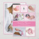 Este anúncio de nascimento de uma menina rosa-rosa, moderno e clássica, apresenta sete das suas próprias fotos - seis na frente de uma adorável colagem fotográfica, e um na parte de trás com o seu nome de família monograma dentro inicial de uma coroa clássica cor-de-rosa. Possui um lugar para você colocar as estatísticas de nascimento dela, sua própria saudação, e sentimento. Este é o cartão perfeito para enviar seus entes queridos para anunciar a chegada do seu pequeno!