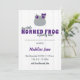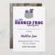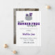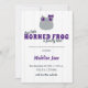 Avise ao mundo sobre sua nova menina sapo! Esta carta bonita é feita em cores roxas e cinzas com um adorável sapo de chifre de menina - completo com arco - no topo. Personalize com os detalhes de natalidade do seu bebê e seus nomes e adicione uma foto vertical no verso.