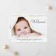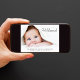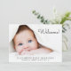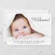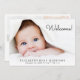 Anúncio de nascimento de um bebê, bonito e simples, neutro em termos de gênero. A foto do seu recém-nascido preenche a frente e é colocada com "Bem-vindo!" em um script contemporâneo (você pode mover este texto para outra área na placa para se adequar à sua foto selecionando "editar na ferramenta design"). Adicione seu nome, data de chegada e estatísticas de nascimento. No verso, adicione duas fotos adicionais da família, uma mensagem "bem-vinda" e os nomes dos pais e irmãos, e o seu agradecimento personalizado nota.