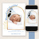 Anúncio personalizado de nascimento de fotos. O modelo de foto está configurado para você adicionar sua própria foto, que é emoldurada em um arco dourado com folhagem fina. "Abençoado e agradecido" é escrito em uma tipografia ousada e arcaica. O resto do texto é totalmente editável para você personalizar com o nome do seu filho, as estatísticas de natalidade e seu próprio nome. Um design moderno, chic, para compartilhar uma foto do seu novo filho.