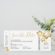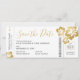 Passe de Embarque Salve o Anúncio de Convite de Data com flores tropicais de hibisco de ouro. Todas as cores de texto e fundo são editáveis para que você possa modificar nossa única modelo de passagem de embarque que foi projetada com um casamento de destino no Havaí ou um casamento de tema de viagem tropical ou renovação de voto em mente. Visite a coleção de designer do Custom Paper Works para coordenar itens.