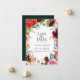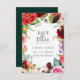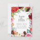 Flores de aquarela, penas e moldura de estilo boêmico elegante, em tons de trendy de burgundy, rosa, verde, vermelho, violeta e pêssego, salve o cartão de data de casamento. A parte traseira da carta apresenta cor verde esmeralda sólida.