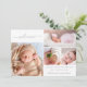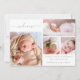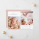 Anuncie a chegada da sua menina com este anúncio de nascimento moderno e duplo lado. Frente apresenta uma colagem de quatro fotos de suas fotos favoritas de bebês com uma simples tipografia de cinza. Personalize com o nome do seu bebê, data de nascimento, estatísticas de nascimento e nomes dos pais. O verso é cor-de-rosa pincelado com bolinhas brancas e inclui espaço para uma foto da família e uma placa de nome da família fofa