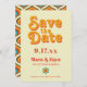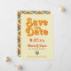 Tema do Boho Chic 70, guarde o anúncio do casamento. Características da placa, tipografia retrô em tons de laranja quente, sotaque floral e padrão de apoio do estilo 70.